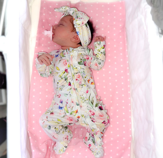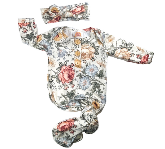 Ultra Soft Floral gardens knotted gown and bow set 0-3months